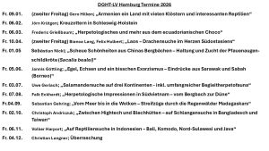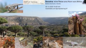 Liebe Mitglieder, Freundinnen und Freunde des DGHT-Landesverbandes Hamburg, bei unserem letzten Vereinsabend am Freitag, den 05.12.2025, in unserer Vereinsgaststätte „Castello“, Sportplatzring 47, 22527 Hamburg, durften wir als Referenten Stefan Ziesmann aus Voerde mit seinem Vortrag „Socotra: eine Reise ans Horn von Afrika“ begrüßen. Im Frühling 2024 besuchte Stefan Socotra, eine Insel im Indischen Ozean von der Größe Mallorcas. Socotra liegt ca. 350 km südlich vom Jemen, zu dem es politisch gehört, und über 200 km östlich vom Horn von Afrika. Die dünn besiedelte Insel zeichnet sich durch Halbwüstenklima und wegen ihrer Abgeschiedenheit durch einen hohen Grad von Endemismus aus: neben Drachenbaumwäldern und Wüstenrosen sind dort zahlreiche endemische Geckoarten zu finden, darunter als größte, fast 30 cm Gesamtlänge erreichende Art Haemodracon riebeckii, der Socotra-Riesengecko. In großartigen Fotos zeigte Stefan die Landschaften, Vegetation und (Herpeto-)Fauna Socotras, selbst das Socotra-Chamäleon (Chameleo monachus) und die endemische Sokotra-Nachtnatter (Ditypophis vivax), die mit den Nattern Madagaskars verwandt ist, konnte Stefan fotografieren. Für viele Sokotra-Interessierte waren Stefans Ausführungen auch ernüchternd, denn die Insel hat ein, auch durch den Tourismus wachsendes Müllproblem, das Reisen auf der Insel ist trotz der hohen Preise sehr basal, und die verbleibenden Drachenbaum-Bestände erfahren wegen der vielen Ziegen keine Verjüngung (alles am Boden wachsende wird abgefressen, lediglich die Wüstenrosen scheinen mit ihrem giftigen Milchsaft zu widerstehen).Vielen Dank, lieber Stefan, das war ein toller Einblick in die Insel Socotra und die Möglichkeit, sie zu bereisen!Bei unserem nächsten Vortrag am 9. Januar 2026 (zweiter Freitag!) wird Gero Hilken aus Essen berichten über „Armenien – ein Land mit vielen Klöstern und interessanten Reptilien“. Ihr seid alle herzlich eingeladen (Beginn: 19.45 Uhr), bis dahin wünschen wir euch schöne Weihnachtstage und Guten Rutsch!